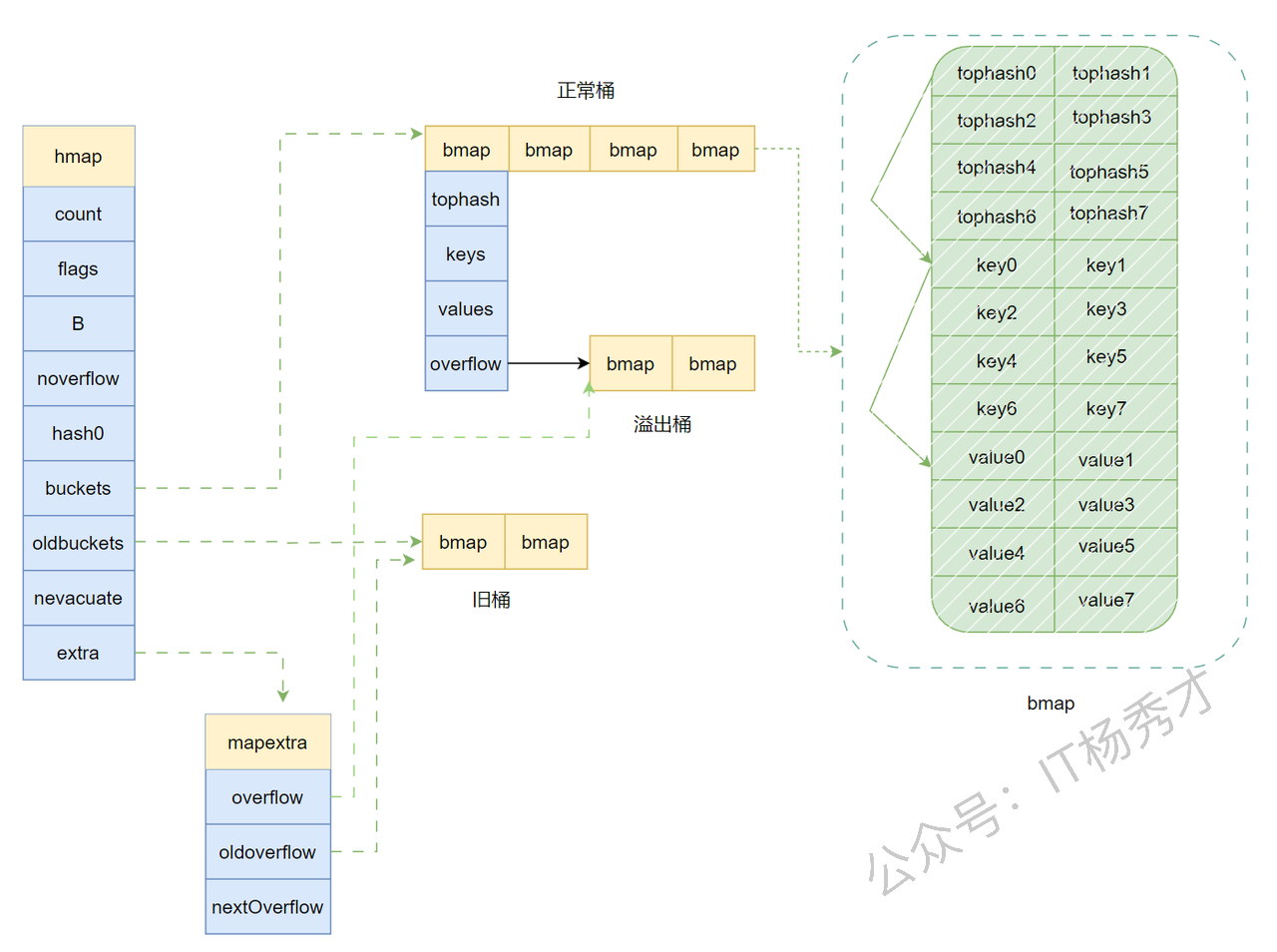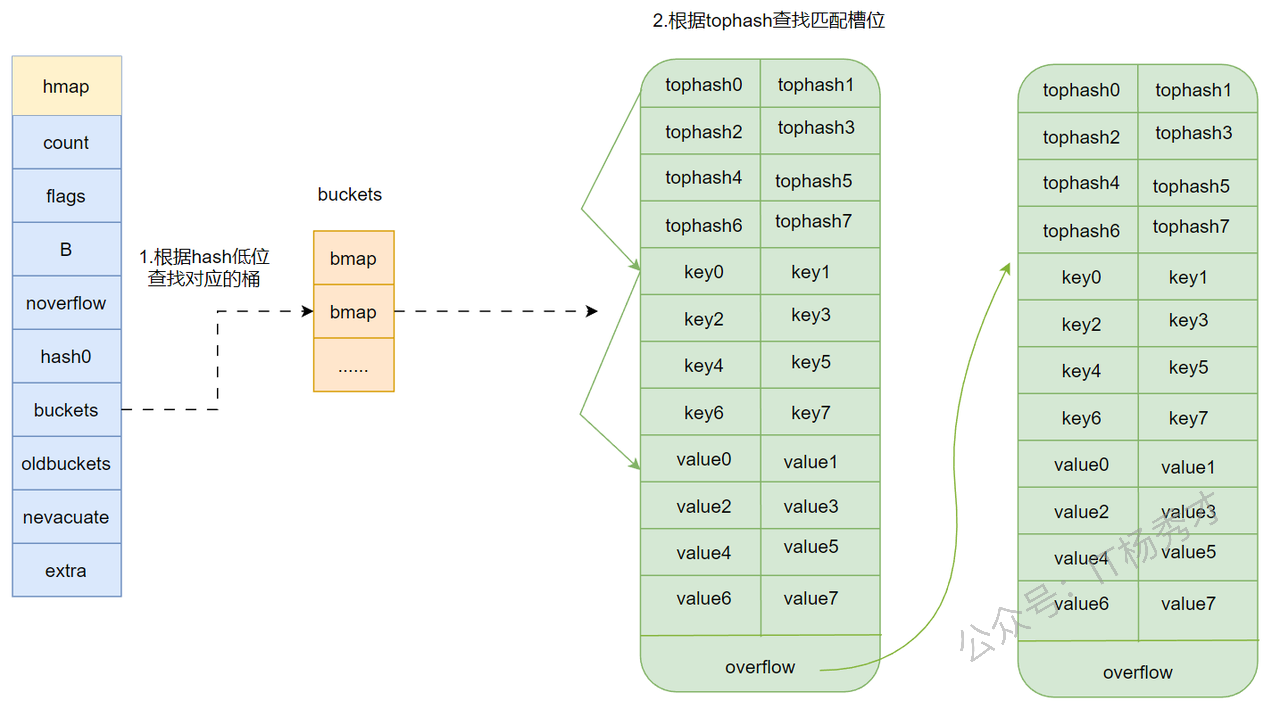tophash相同,就继续比较 key 本身。- key 也相同,就直接返回对应 value。