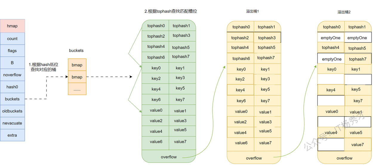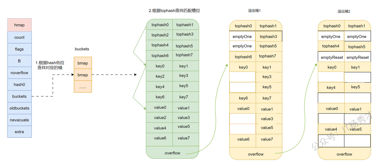 tophash -> key的顺序查找。 - 找到同 key 就覆盖 value;找不到且有空槽就插入;都满了就挂新的溢出桶。